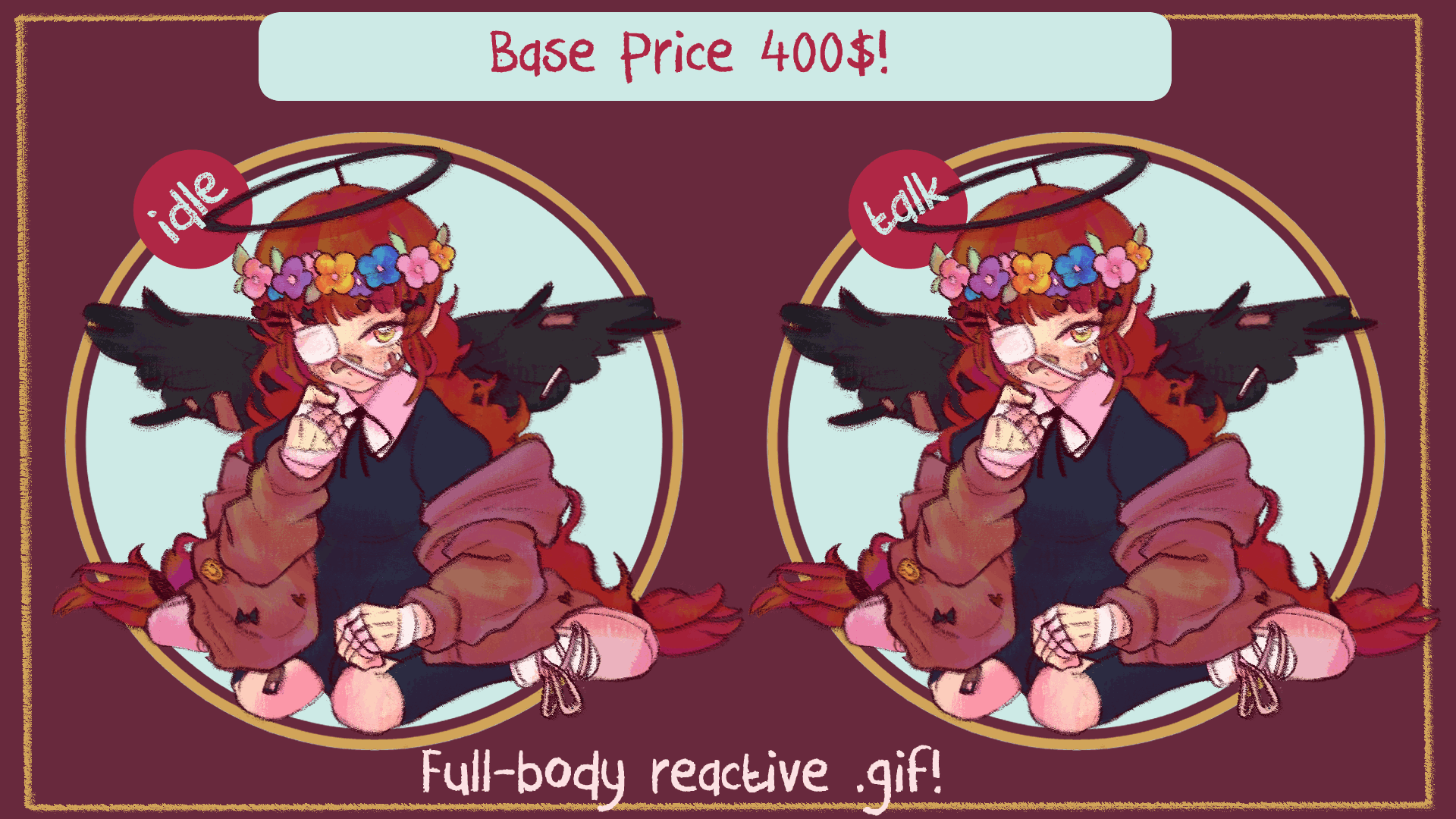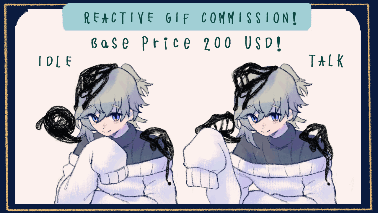 After I'm done with the process I will render the transparent .gif and upload the HD in google drive for you!REVISIONSOnly allowed until the coloring stage (3x max), anything pass that will be charged with revision fee of 50$/revision.ADDITIONAL COSTSfor possible additional cost, there's cost for:- Additional details like flame, pet, or any other secondary animations- Additional/alternate expressions- Complicated details (like outfit with a lot of details or armor)The additional cost would be 40 usd for each of the details!- Character Design will be charged using Illustration Commission prices (vary between Bust-up - Full-body Prices and details)- Rush order is available, the cost would be 50 usd.DEADLINES AND DELIVERYFinished product will be delivered within 2 weeks minimum after the sketch, can be faster if possible.Please pay within 3 days after the sketch delivery, I will not work on unpaid sketch!USEFor personal use only with exceptions of usage in monetized streams/thumbnails. No printed commercial merchandise and/or contents behind paywall. No usage in song covers/monetized videos/shorts (commercial price may be applied, you can ask if not sure!). No NFT or AI learning.INTELLECTUAL PROPERTY RIGHTSI, funayfunay, have the right to publish the finished product with credits to the owner of the character. Clients may publish the finished product with credits to funayfunay. Please refrain to feed the finished product to AI learning.PAYMENTPayment will be done through Paypal (USD) and BCA (IDR)REFUNDSNo Refunds.COMMUNICATIONPlease provide your socials (twitter or discord, discord is preferred) for communication!===========================================================================